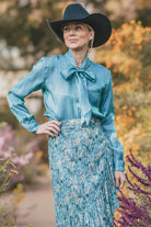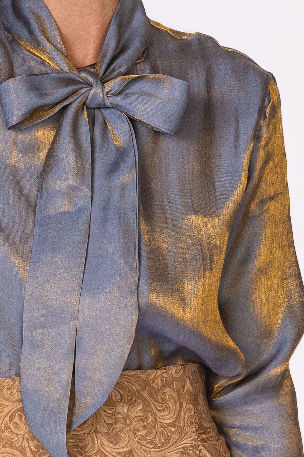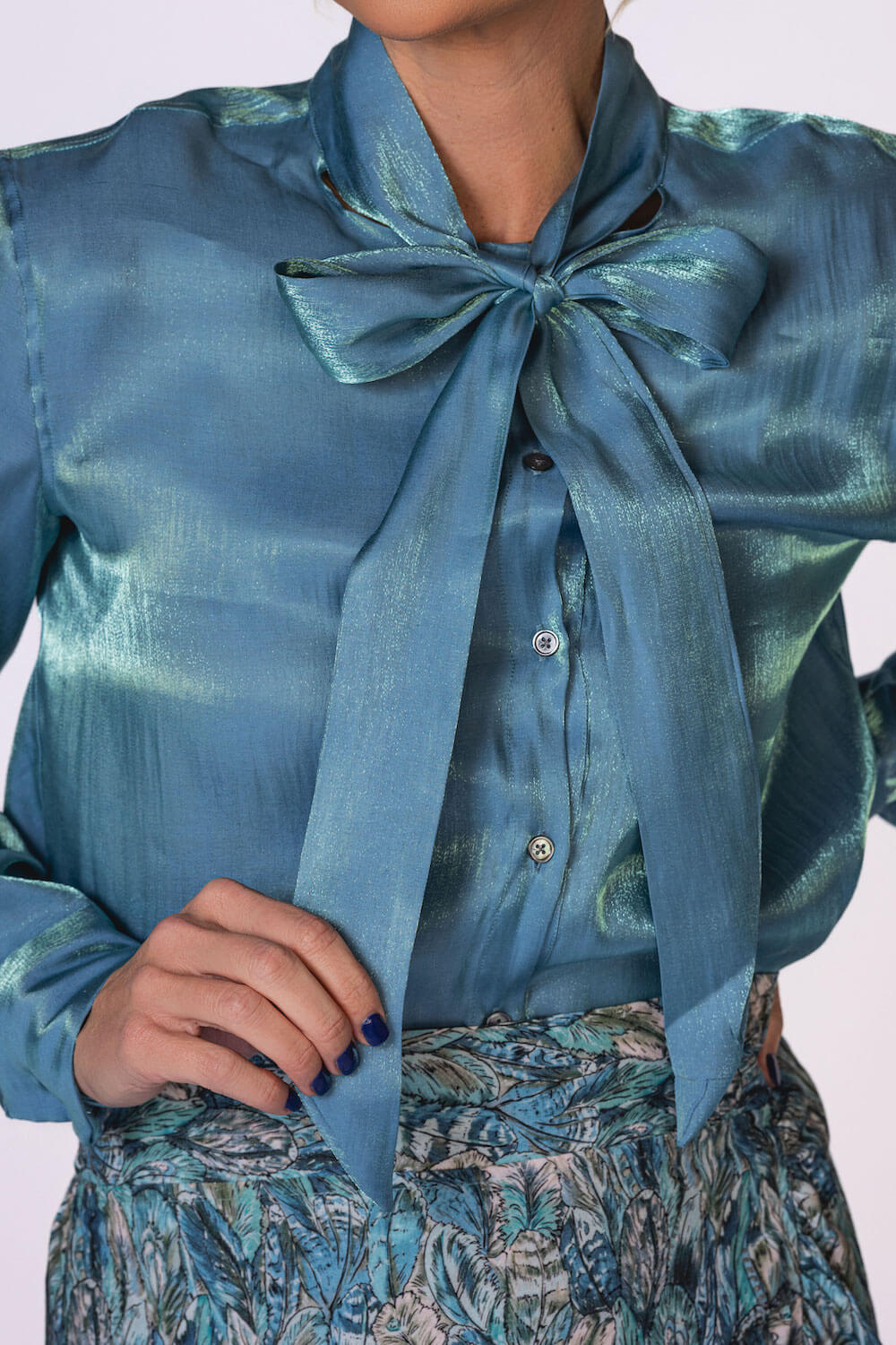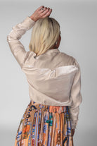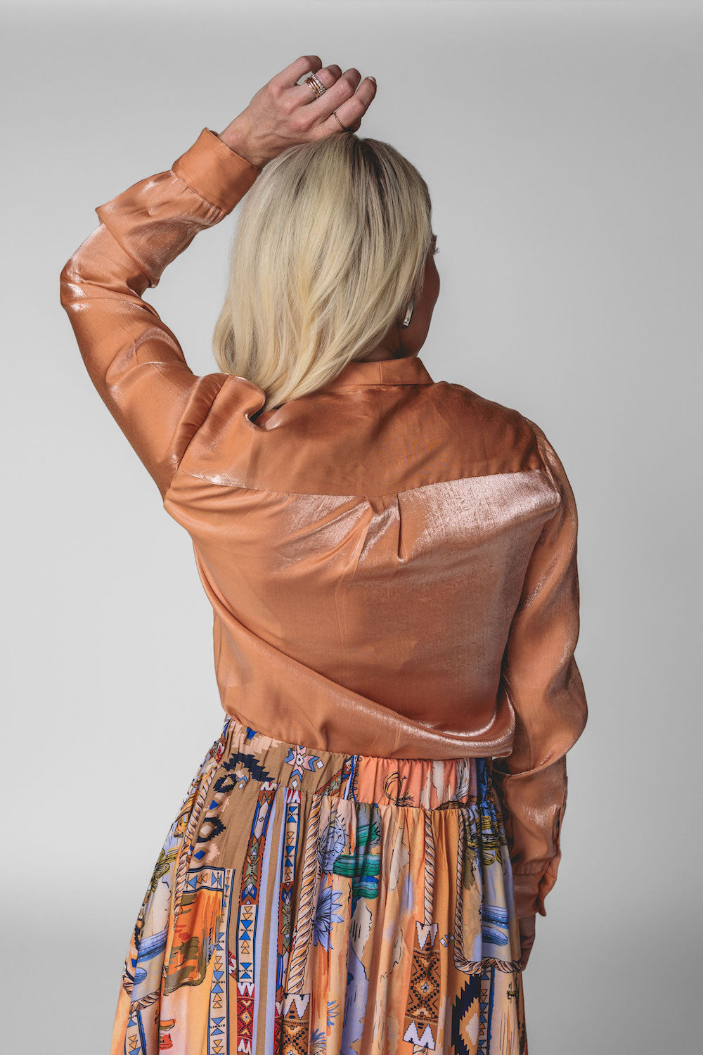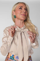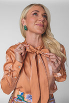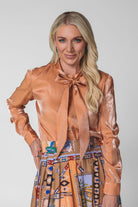 Subtle shimmer meets timeless elegance in the Belle Top. Crafted from a beautiful iridescent rayon–nylon blend, this top catches the light just enough to make you stand out with effortless class. Lightweight and fluid, it drapes softly for a refined, flattering fit. Designed with a button-front closure and an attached bow tie, the Belle Top adds a feminine finish that feels both modern and sophisticated. Available in our stunning spring shades Sand and Sunset Orange, it’s the perfect piece for elevating everyday looks or dressing up for special moments. Key Features