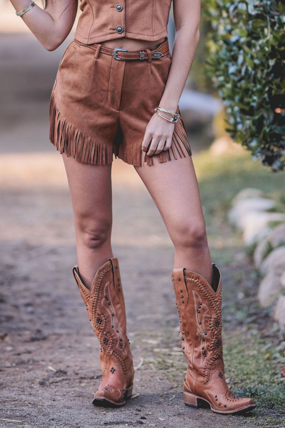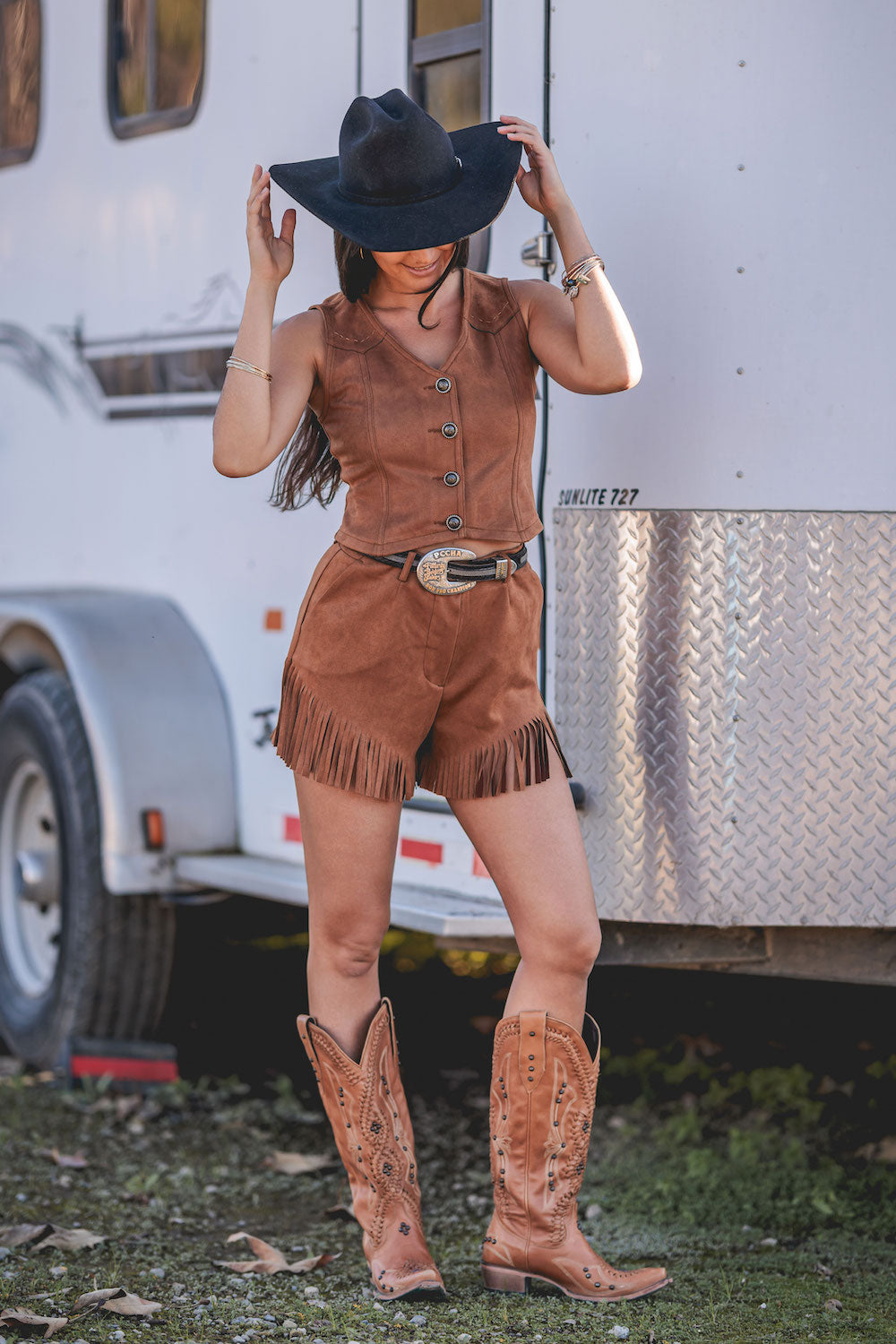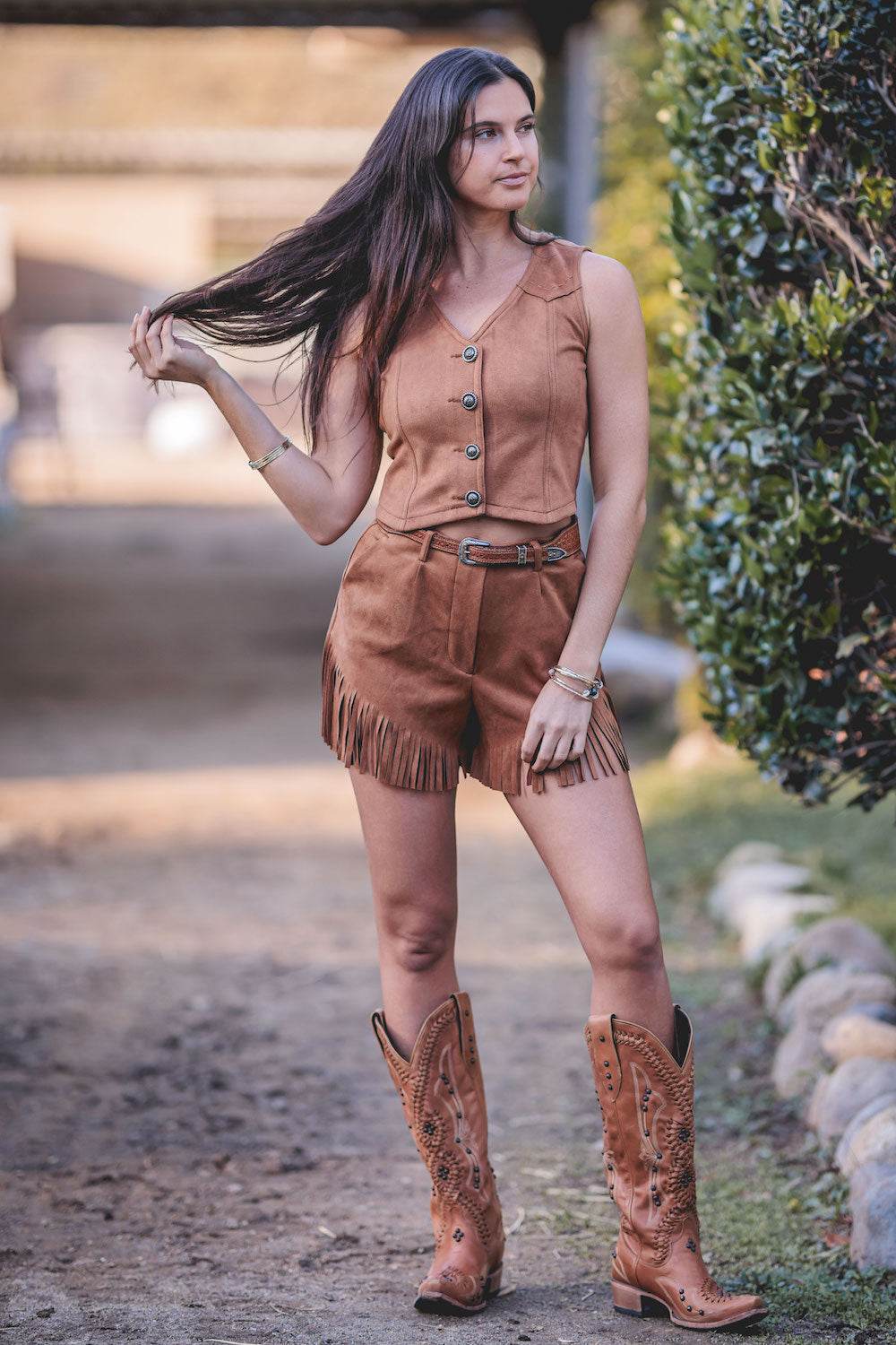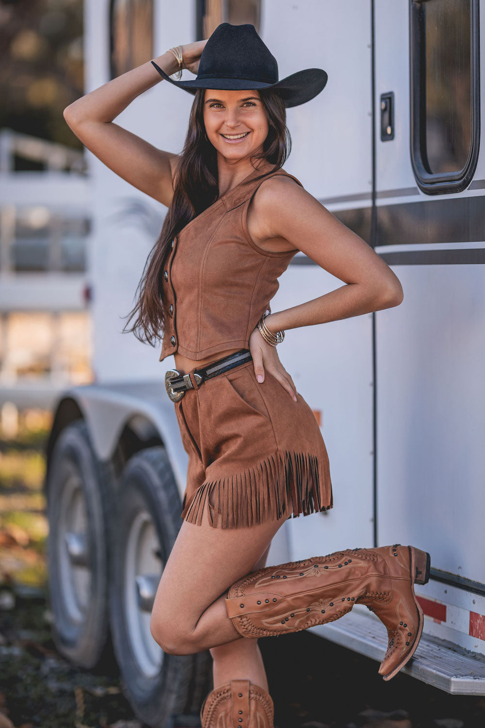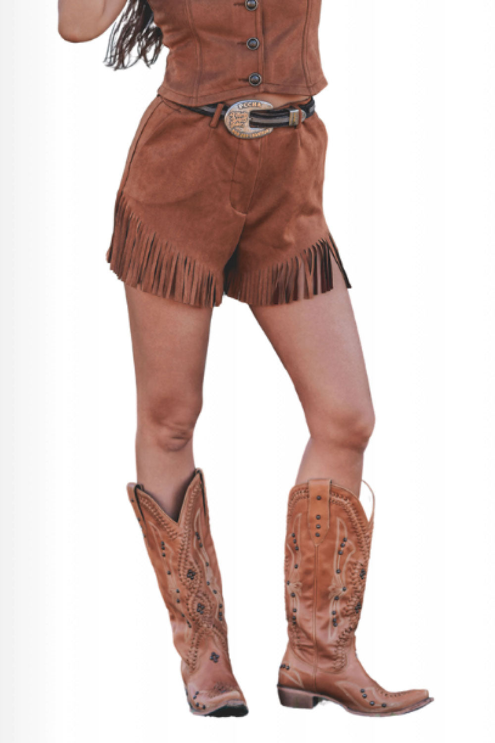 Step up your style with the Brittany Jo Short, a chic twist on our classic Britt Short silhouette. Crafted in vegan ultra-suede in a rich Whiskey Brown, these shorts bring texture, warmth, and personality to any look. With the same flattering fixed waistband and zipper closure as the Britt Short, the Brittany Jo Short adds a playful edge with its angled fringe hem, giving movement and character to every step. Sleek slit side pockets and belt loops make it as functional as it is stylish—perfect for pairing with a blouse, blazer, or casual top for a standout outfit.Key Features