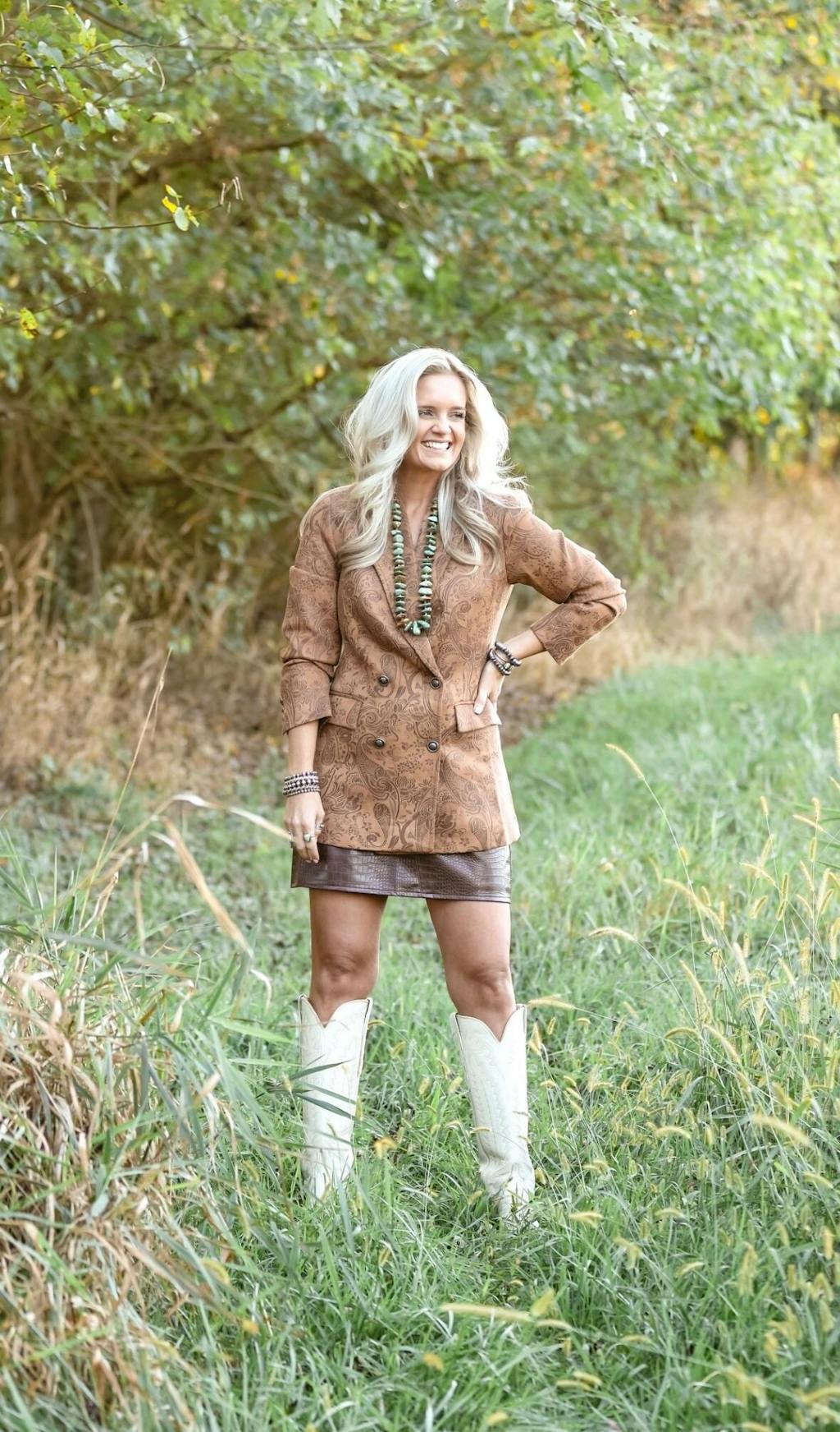 "I love nothing more than a classic blazer with unique finishing touches. The embossed vegan suede and button details add a feminine, flirty flair, while the tailored fit ensures a one-of-a-kind look. This versatile staple is a must-have for every wardrobe!"
