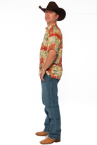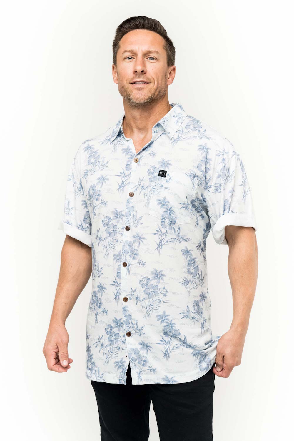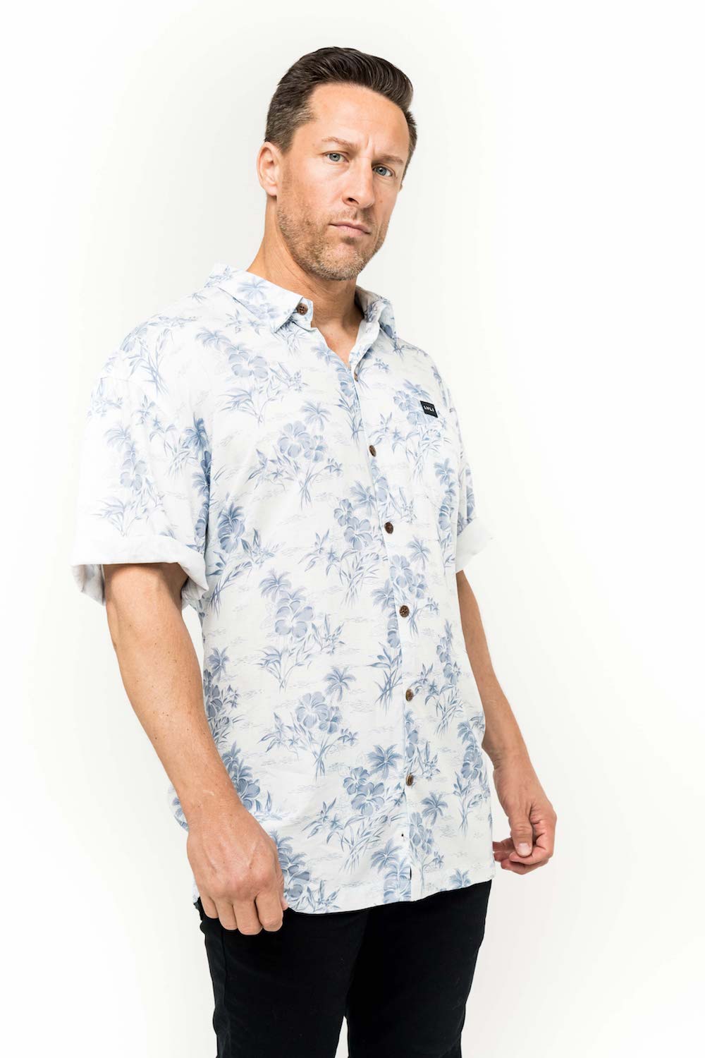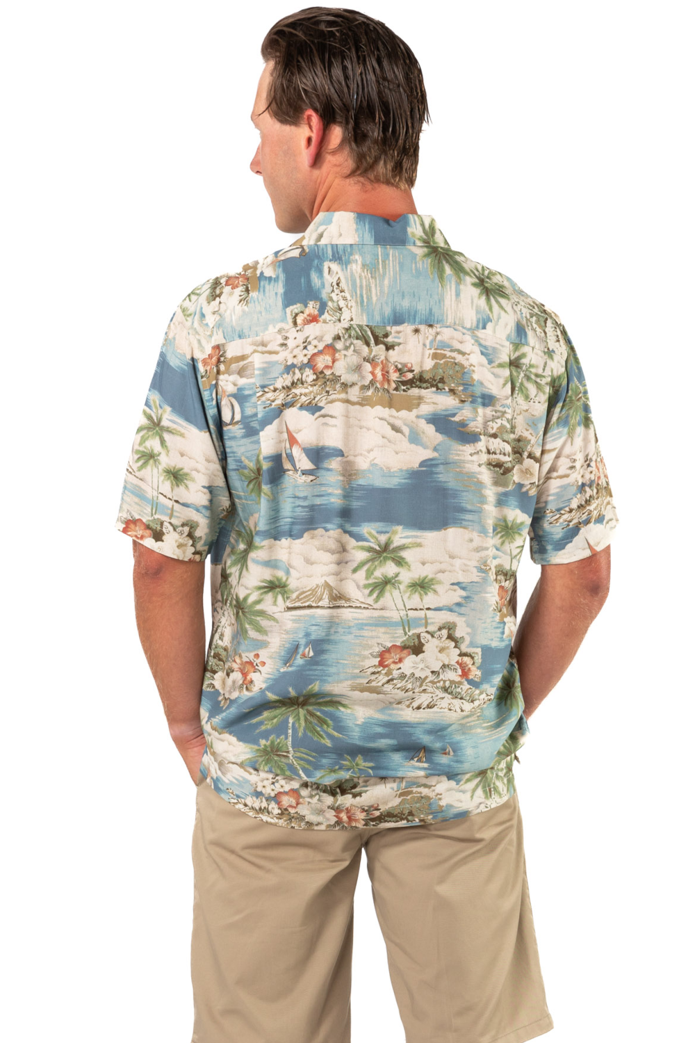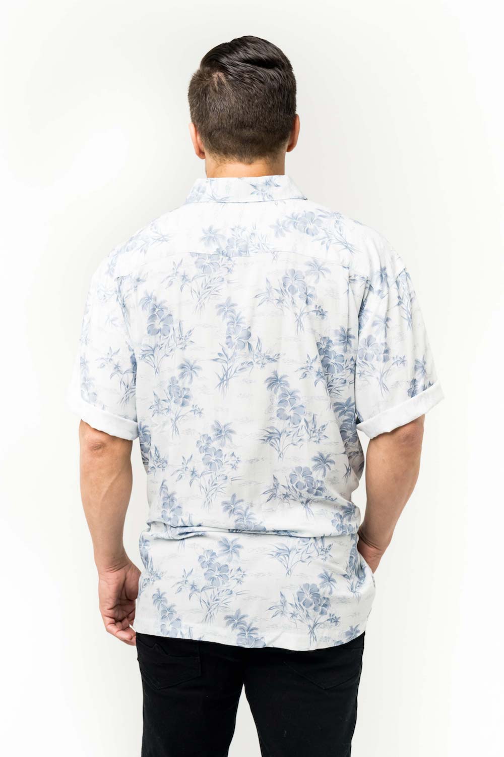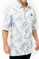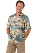 This men's slim-cut Hawaiian-style shirt will keep you cool and comfortable throughout the day and evening. The coconut buttons and slight slit on the side hems elevate the balance of function and style. Plus, you can match your lady with our ‘his and her’ prints! 100% Rayon Poplin for a smooth feel every man will love. SKU# 22MS1001.