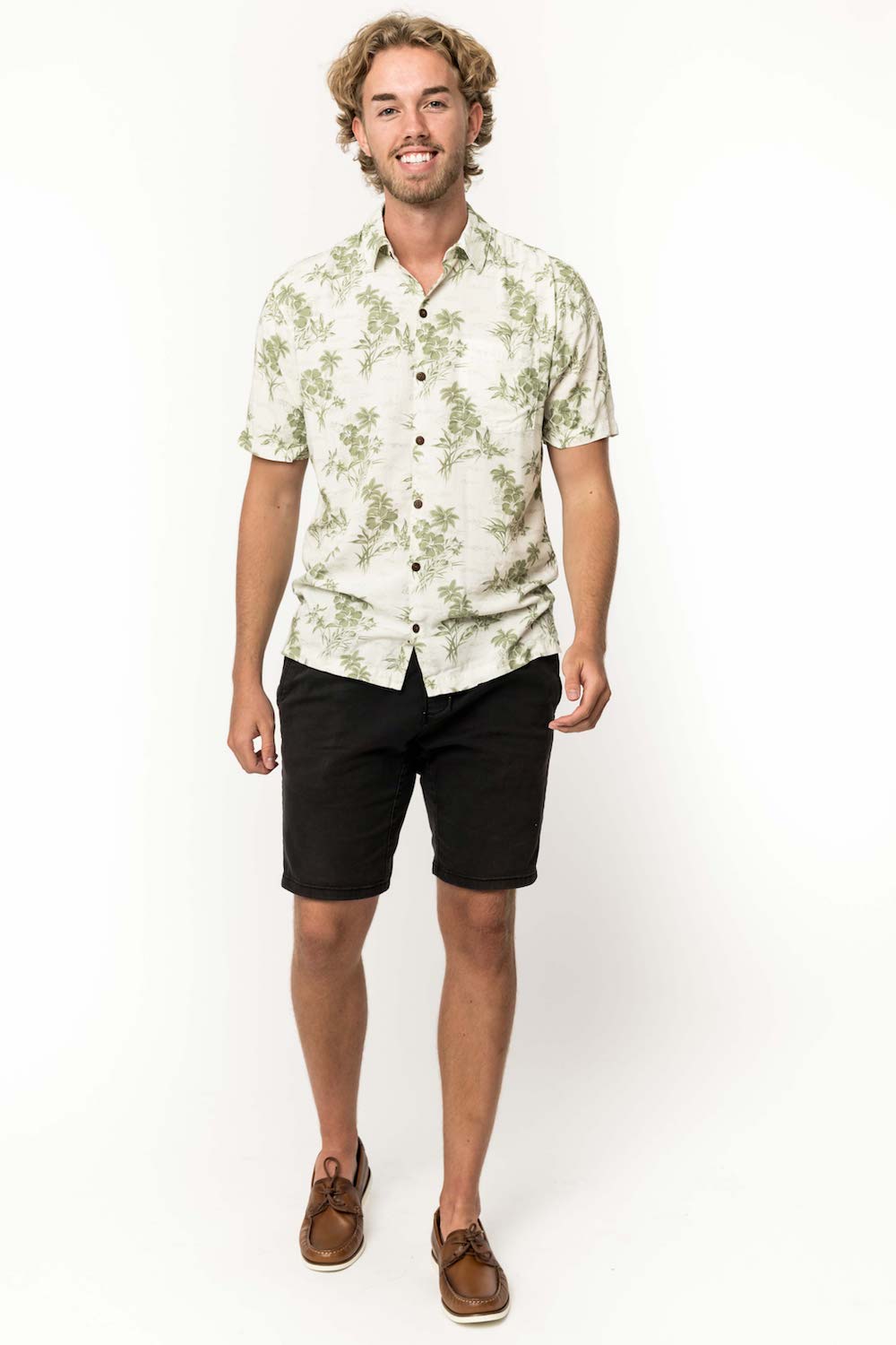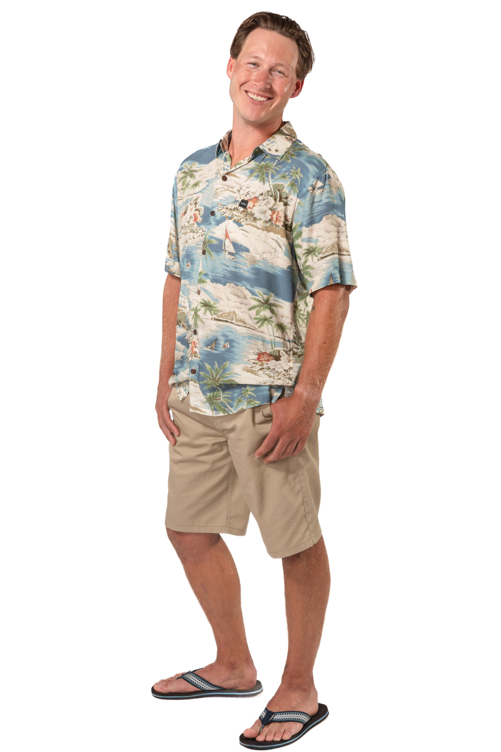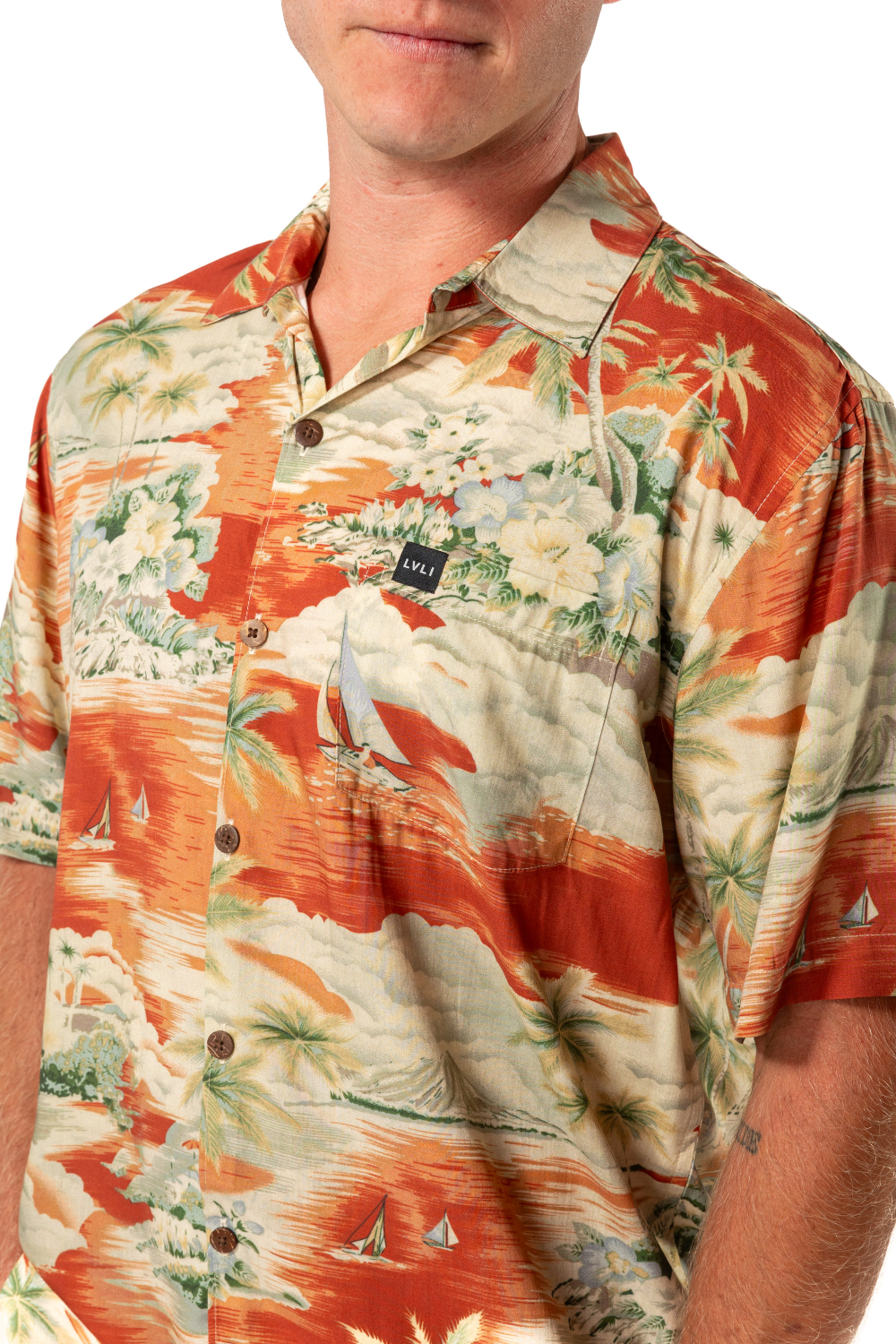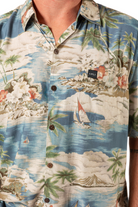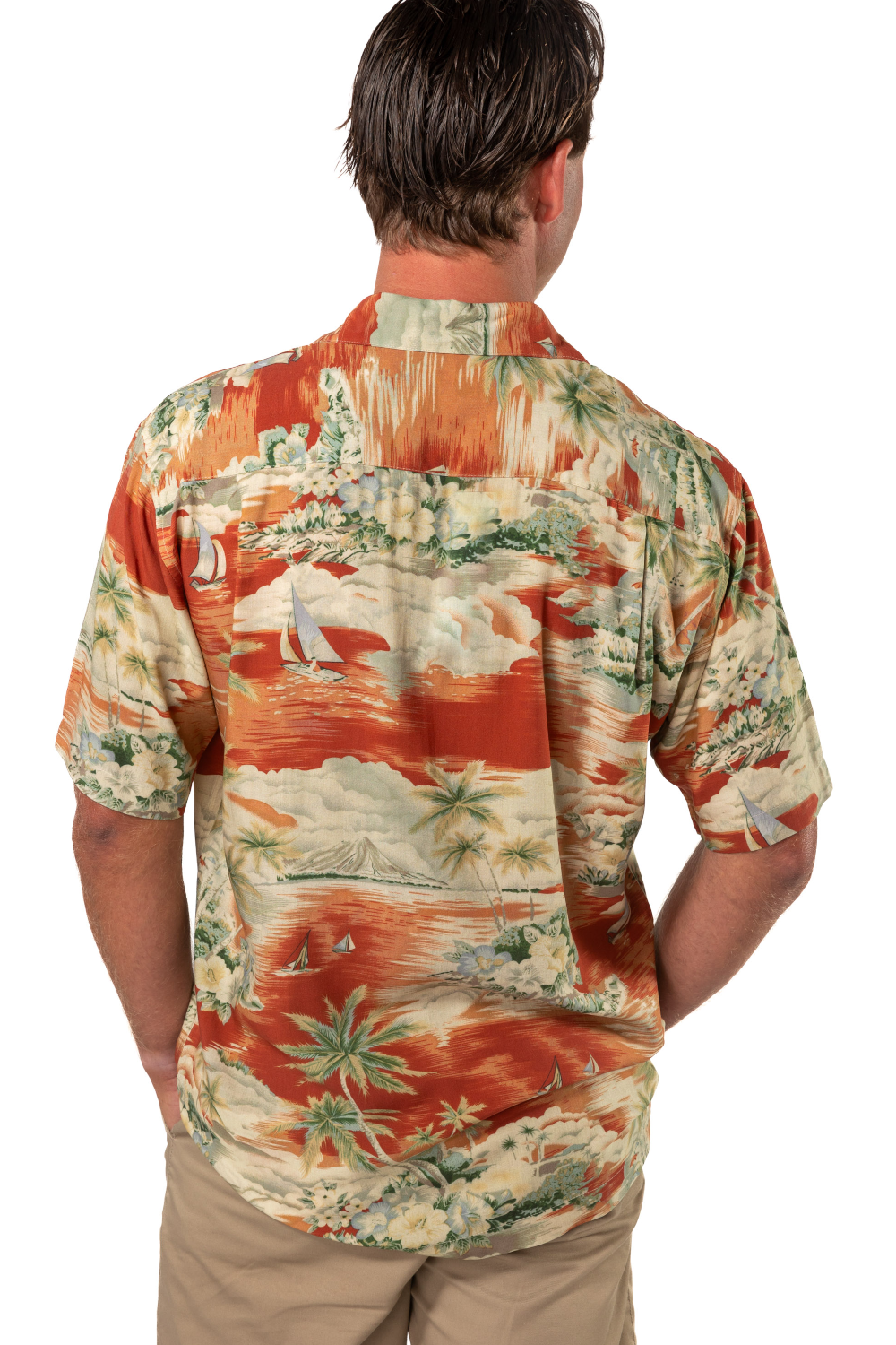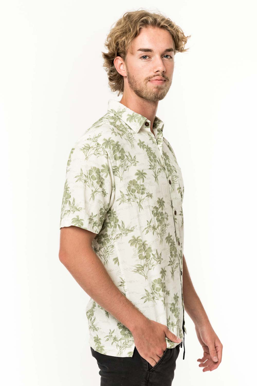 This men's slim-cut Hawaiian-style shirt will keep you cool and comfortable throughout the day and evening. The coconut buttons and slight slit on the side hems elevate the balance of function and style. Plus, you can match your lady with our ‘his and her’ prints! 100% Rayon Poplin for a smooth feel every man will love. SKU# 22MS1001.