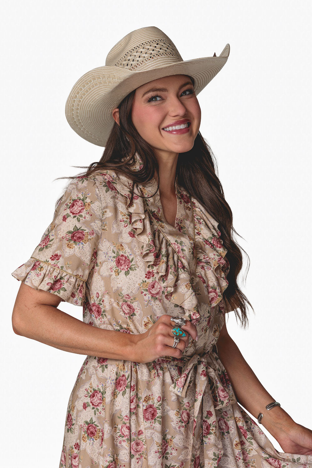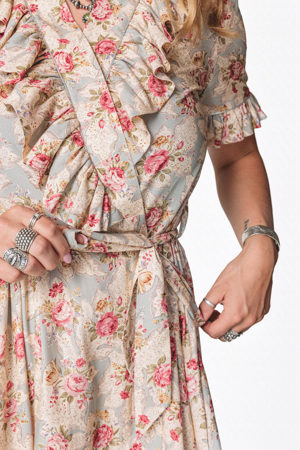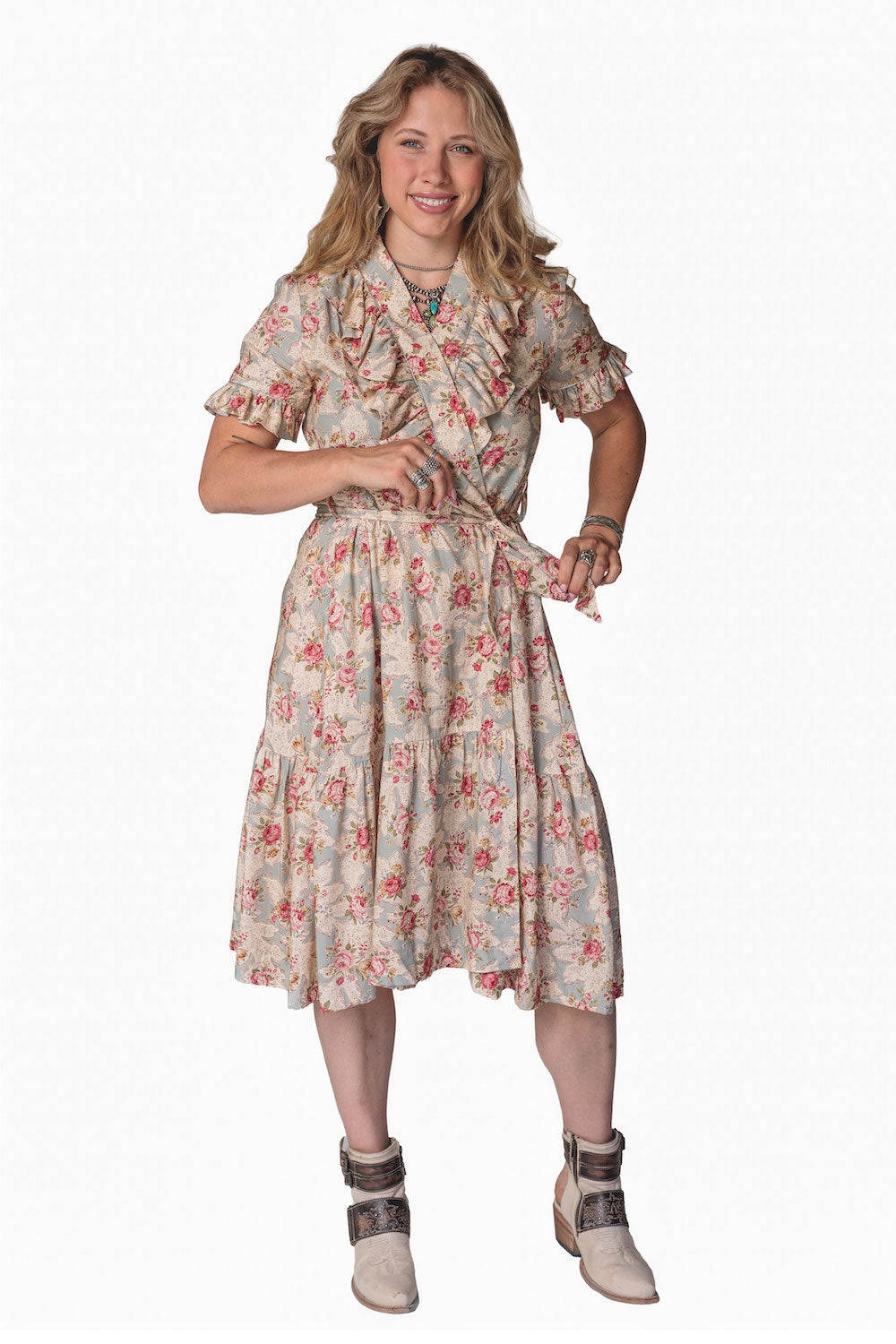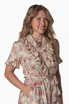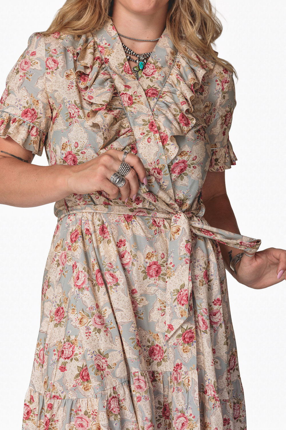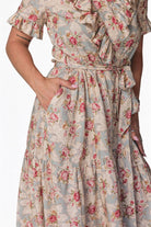 Effortlessly feminine with a touch of shimmer, the Olivia Wrap Dress is designed to move beautifully with you. Featuring a soft wrap silhouette and a romantic ruffle V-neck collar, this dress is finished with delicate metallic piping for an elevated, eye-catching detail. The flowing full skirt drapes gracefully, while the ruffled hem adds movement and charm with every step. A removable belt allows you to style it your way—wear it cinched for a polished look or swap in your own belt to dress it up or down. Perfect for day-to-night wear, special occasions, or anywhere you want to feel effortlessly chic.Key Features
