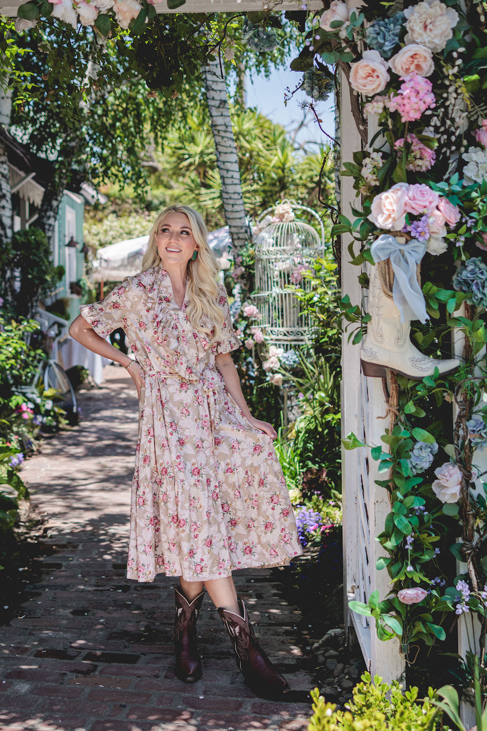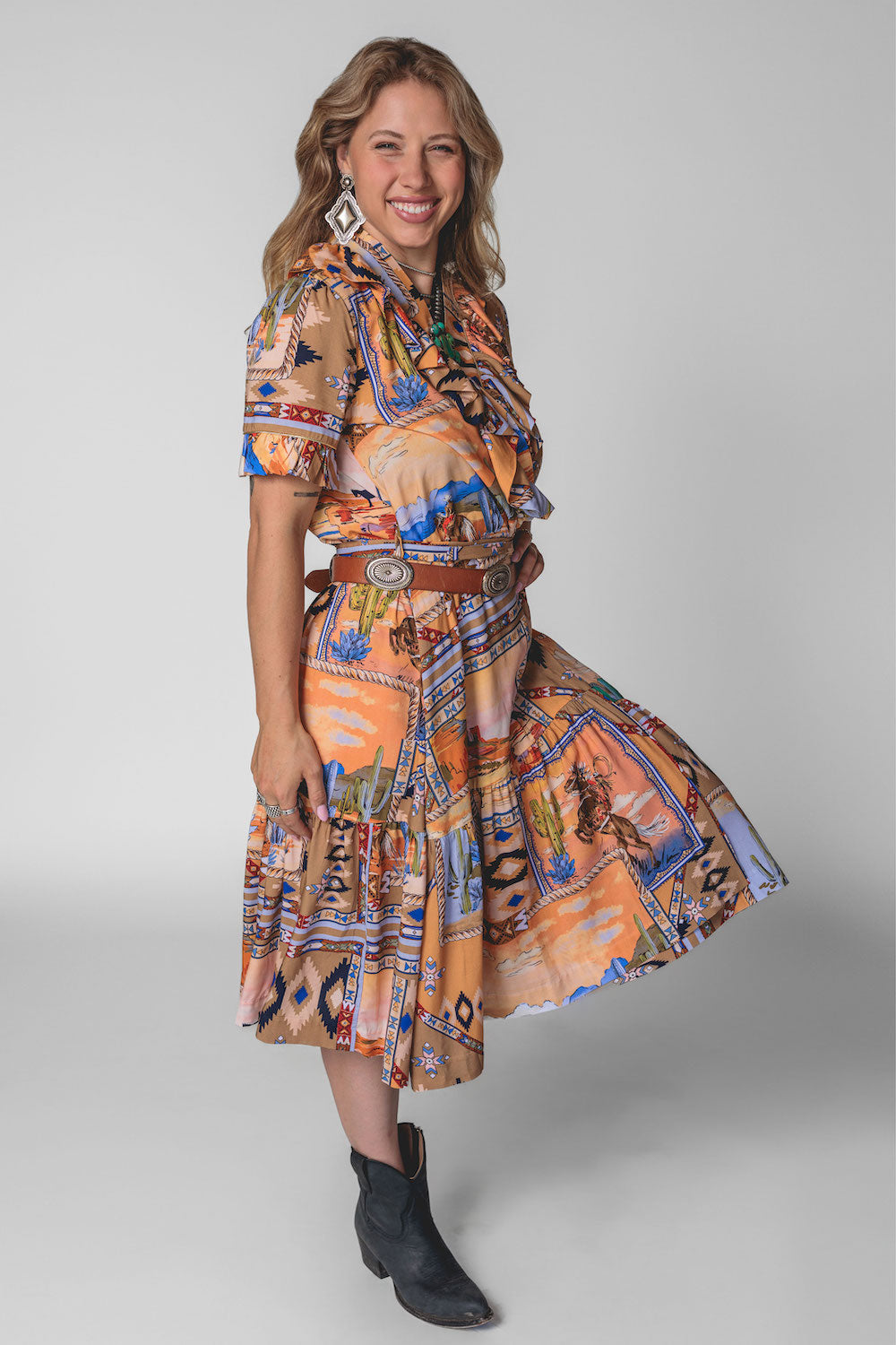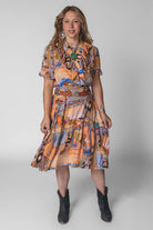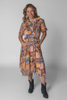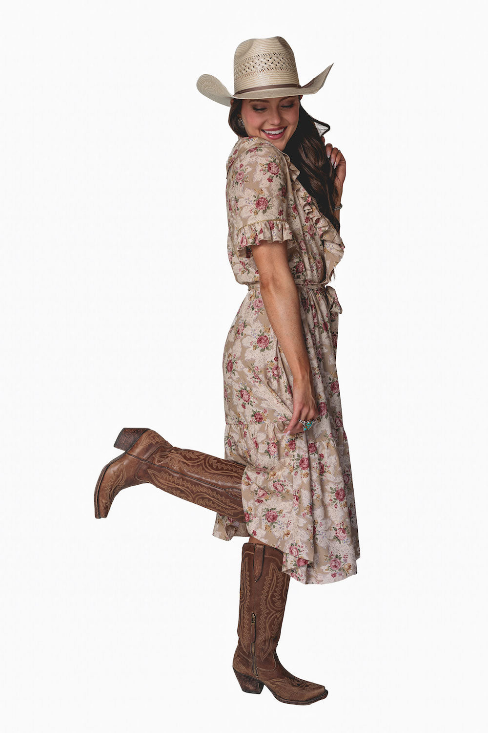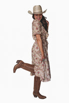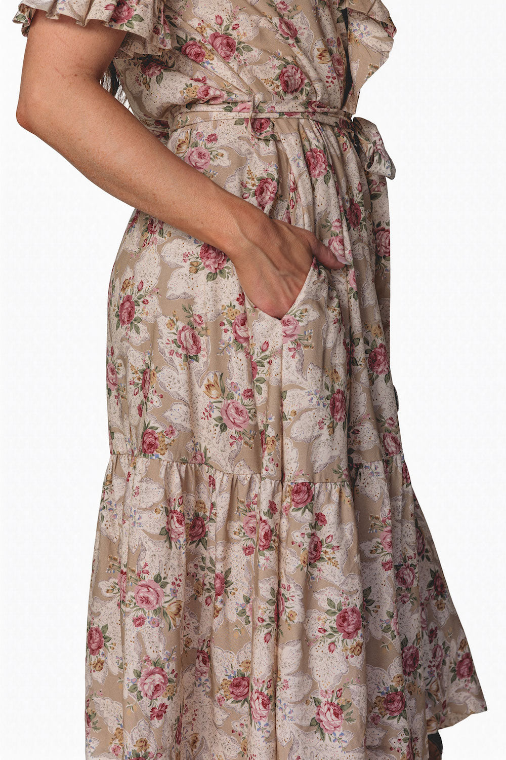 Effortlessly feminine with a touch of shimmer, the Olivia Wrap Dress is designed to move beautifully with you. Featuring a soft wrap silhouette and a romantic ruffle V-neck collar, this dress is finished with delicate metallic piping for an elevated, eye-catching detail. The flowing full skirt drapes gracefully, while the ruffled hem adds movement and charm with every step. A removable belt allows you to style it your way—wear it cinched for a polished look or swap in your own belt to dress it up or down. Perfect for day-to-night wear, special occasions, or anywhere you want to feel effortlessly chic.Key Features