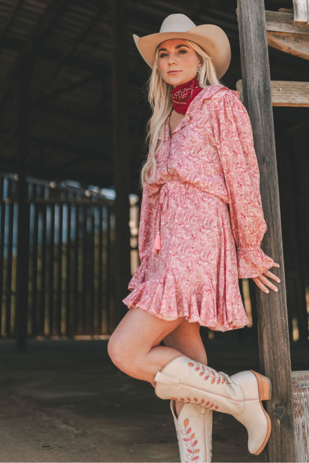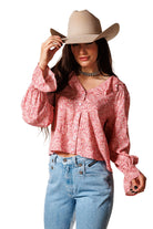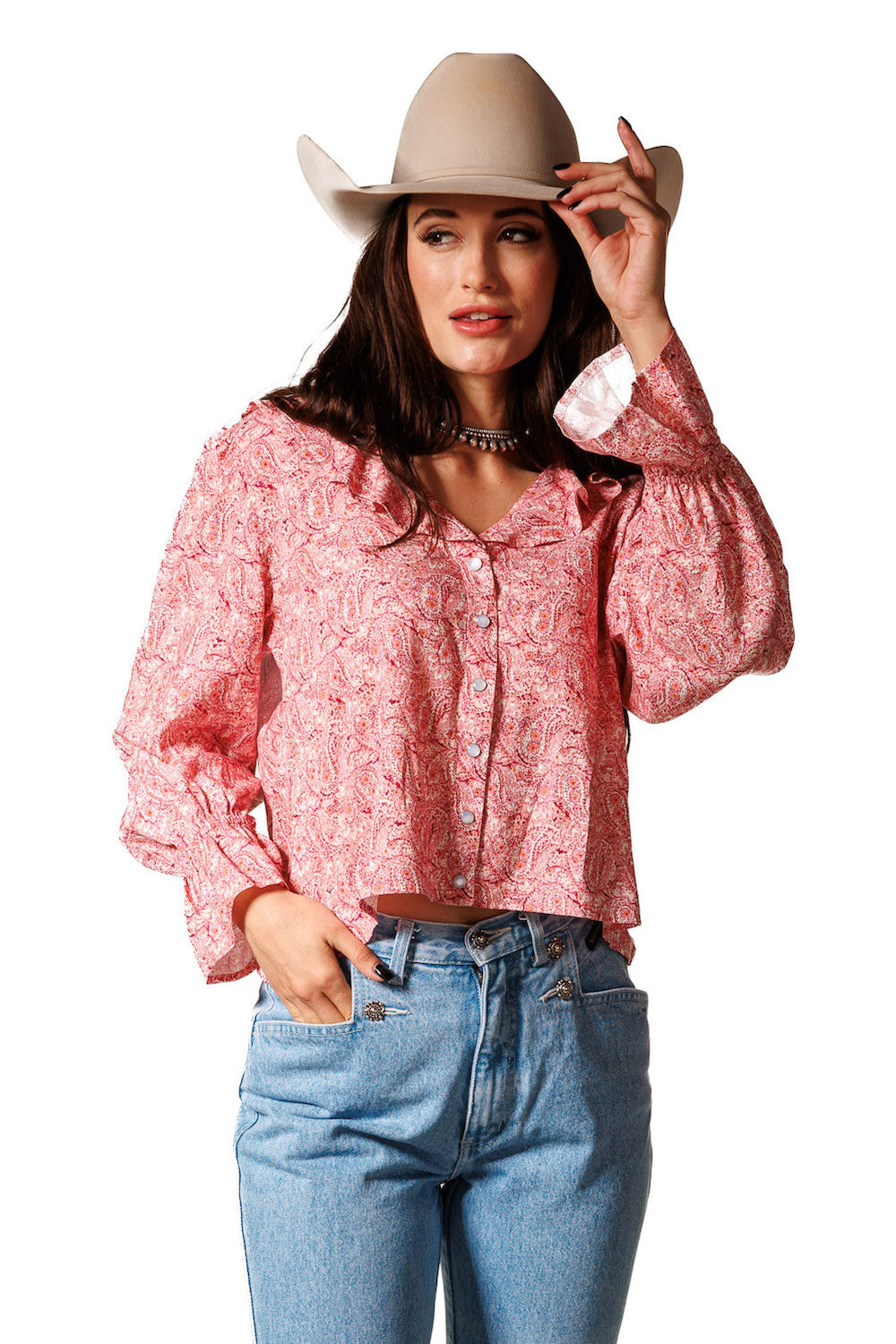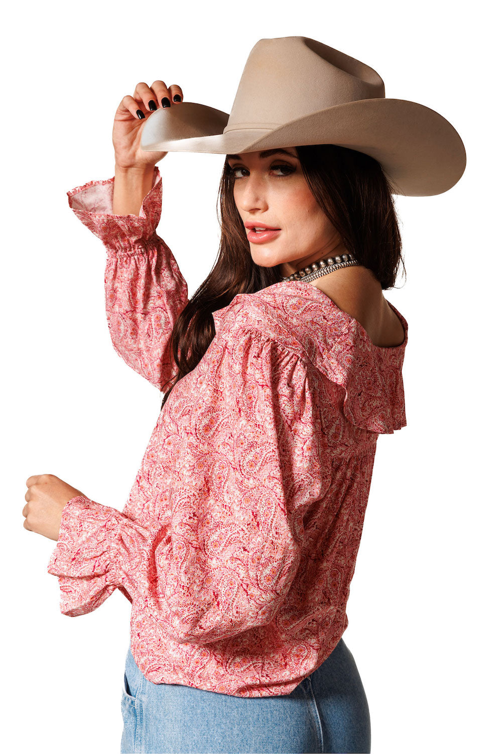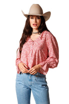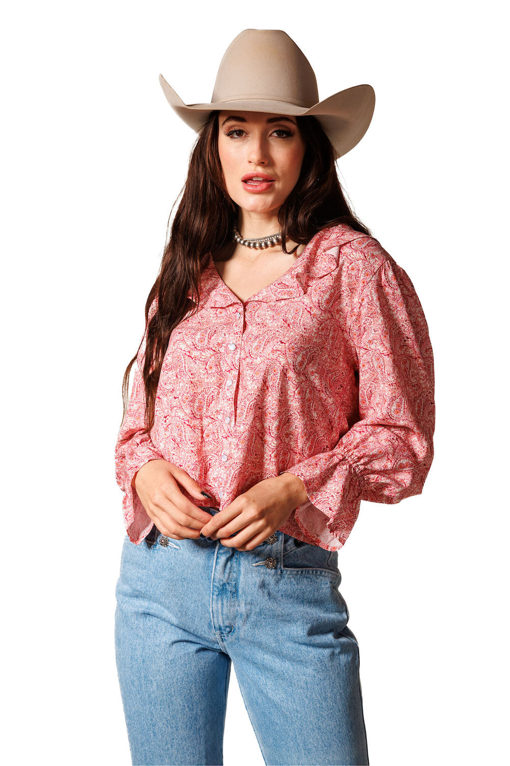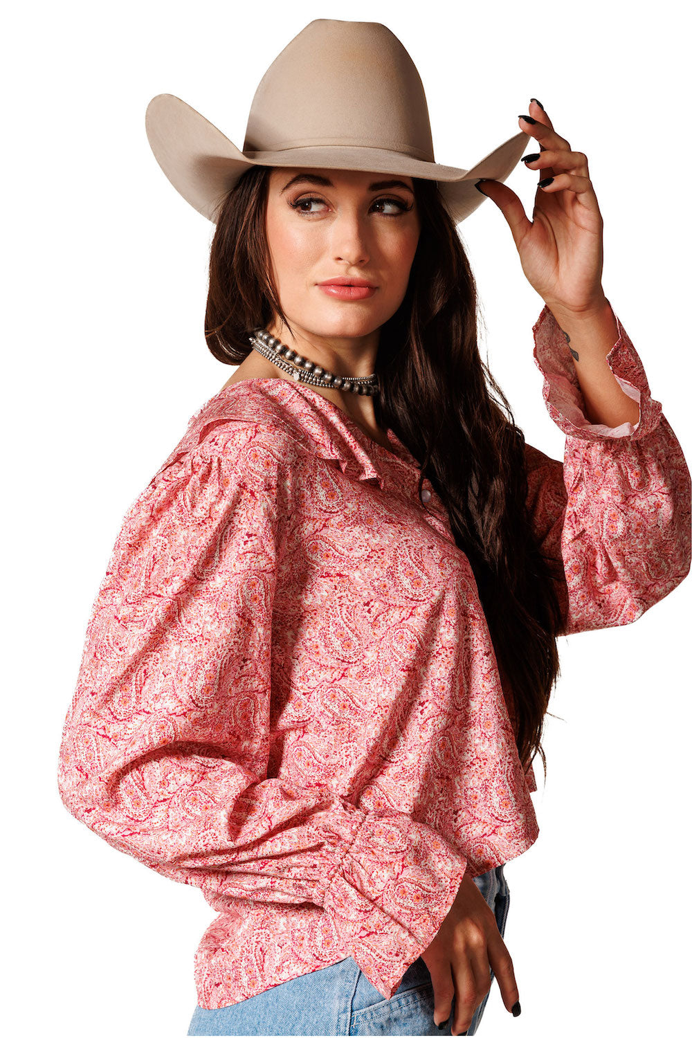 This charming round-neck top is highlighted by a delicate ruffle detail around the neckline front and back. Featuring pearl snap buttons down the front, long sleeves with elastic wrists, and beautiful ruffled cuffs, it’s a perfect blend of Western style and feminine flair. 100% Rayon poplin. SKU# 24WS1802.