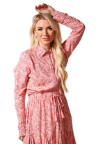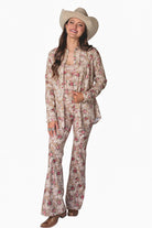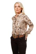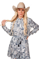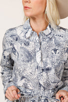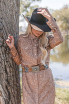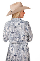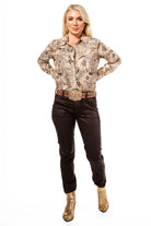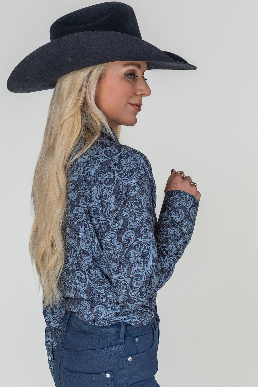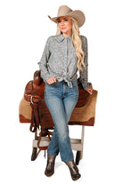 A reimagined balance of traditional western charm and contemporary chic, sure to become a staple in any coastal cowgirl’s closet. Both function and fashion-forward, this 100% Rayon poplin darling has pearl snap buttons and a traditional front and back yoke for the perfect feminine fit. SKU# 23WS1801.
