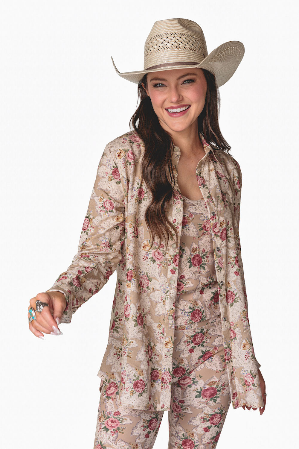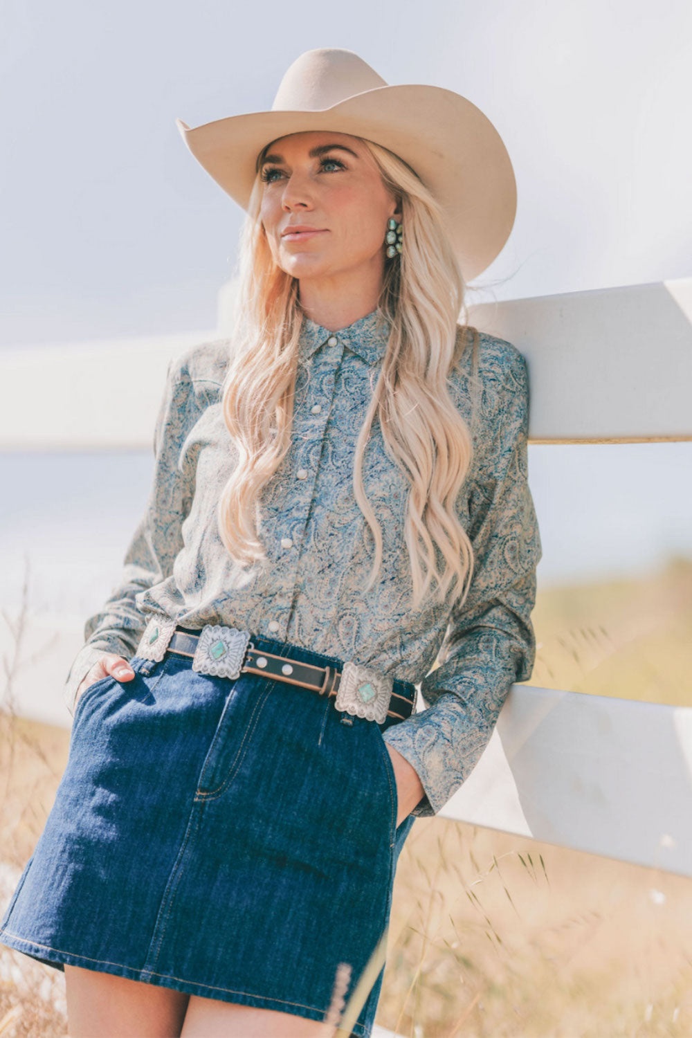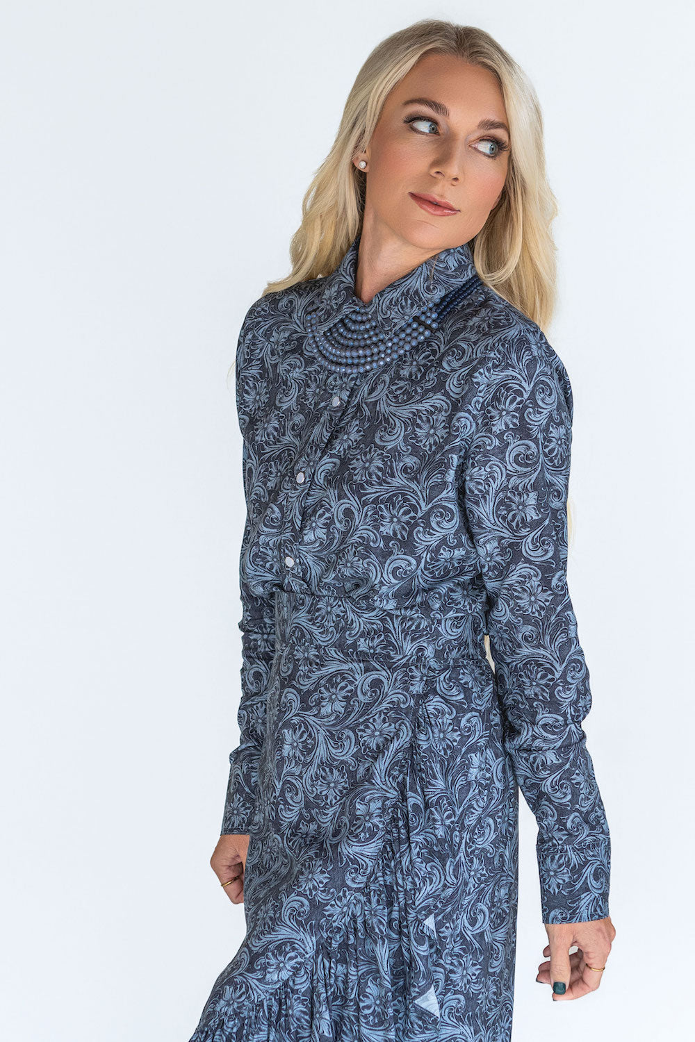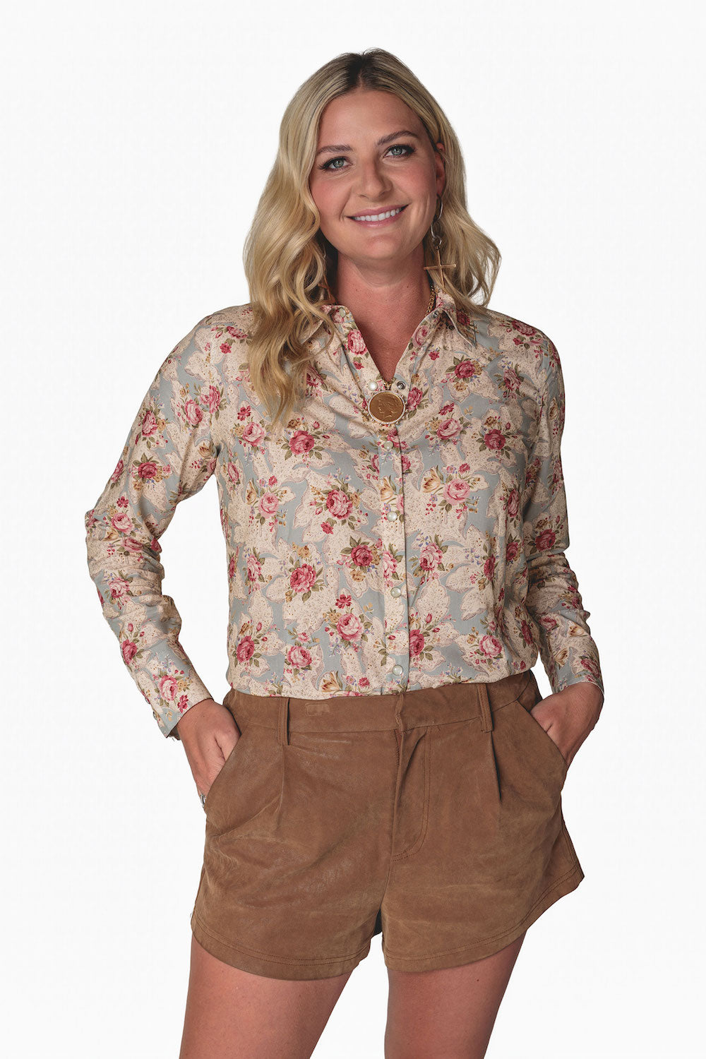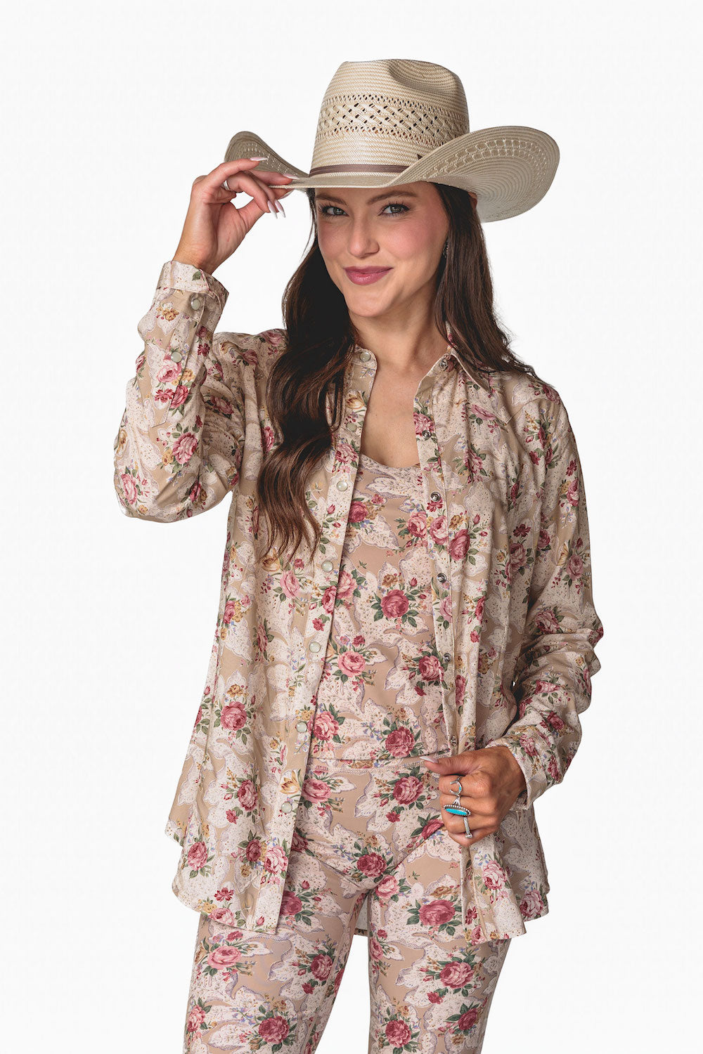 A reimagined balance of traditional western charm and contemporary chic, sure to become a staple in any coastal cowgirl’s closet. Both function and fashion-forward, this 100% Rayon poplin darling has pearl snap buttons and a traditional front and back yoke for the perfect feminine fit.  SKU# 23WS1801.