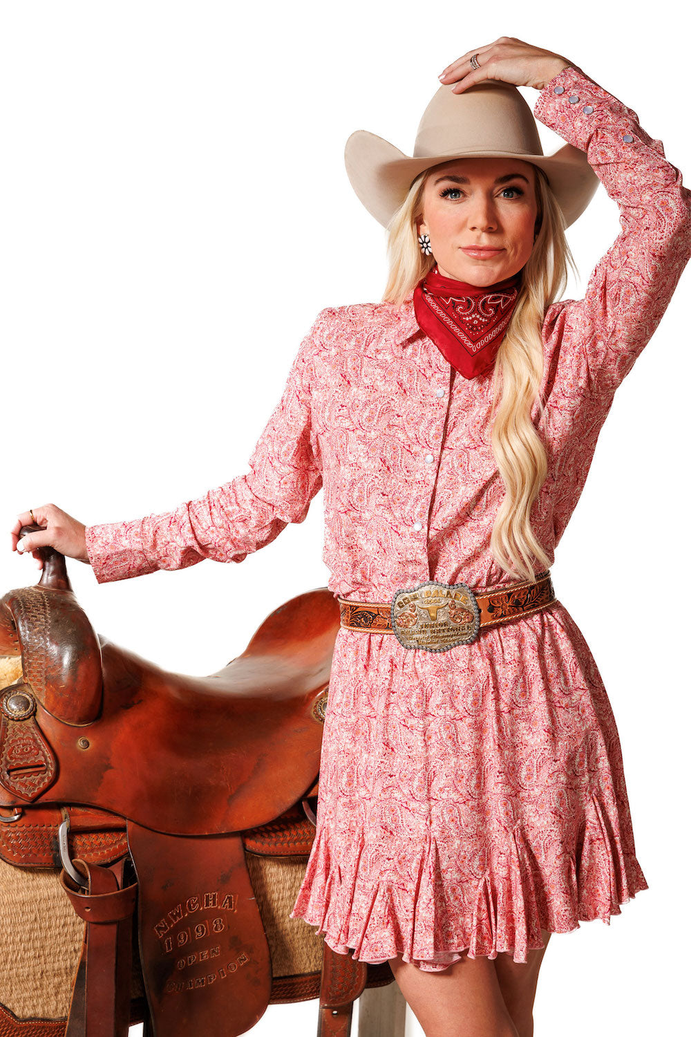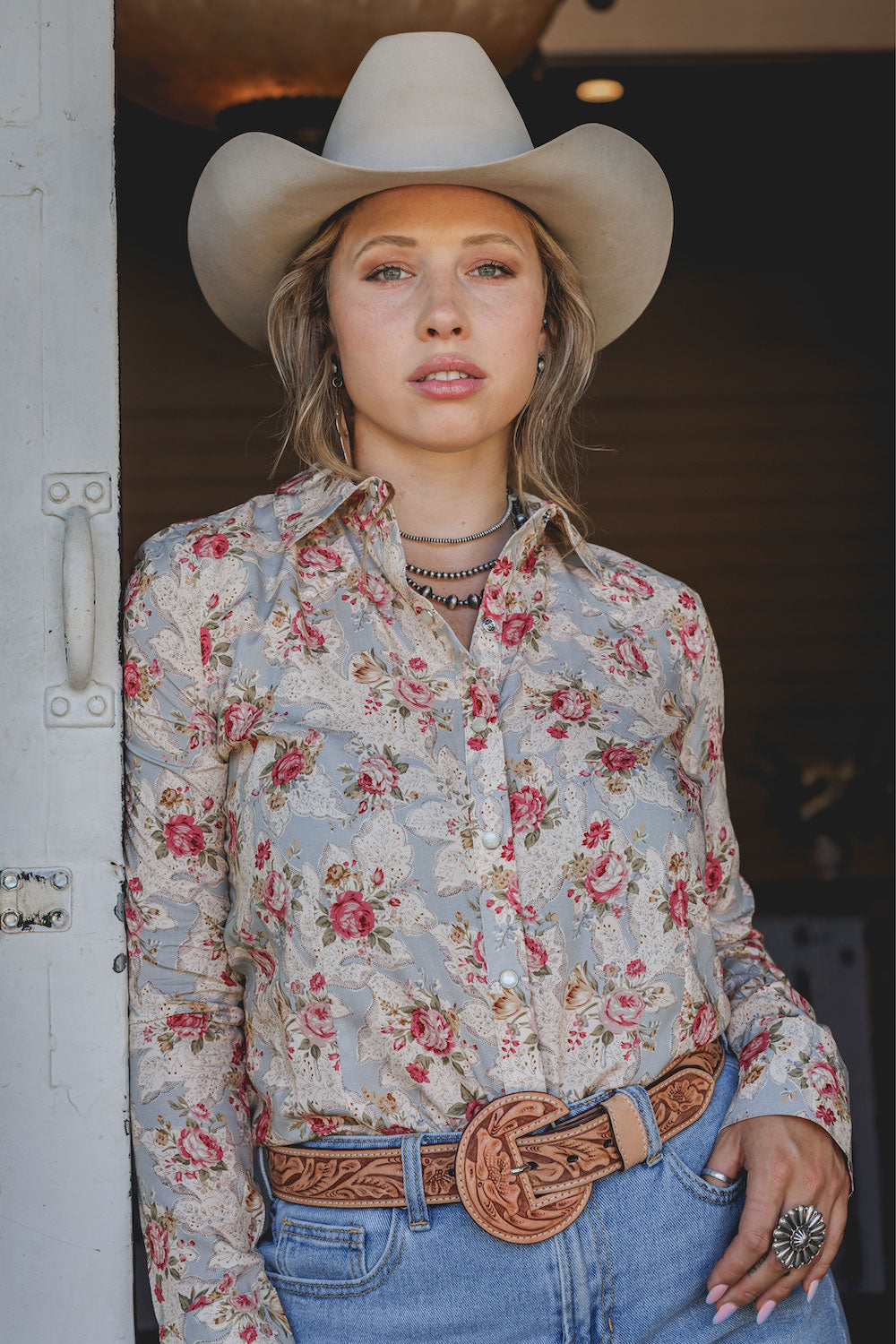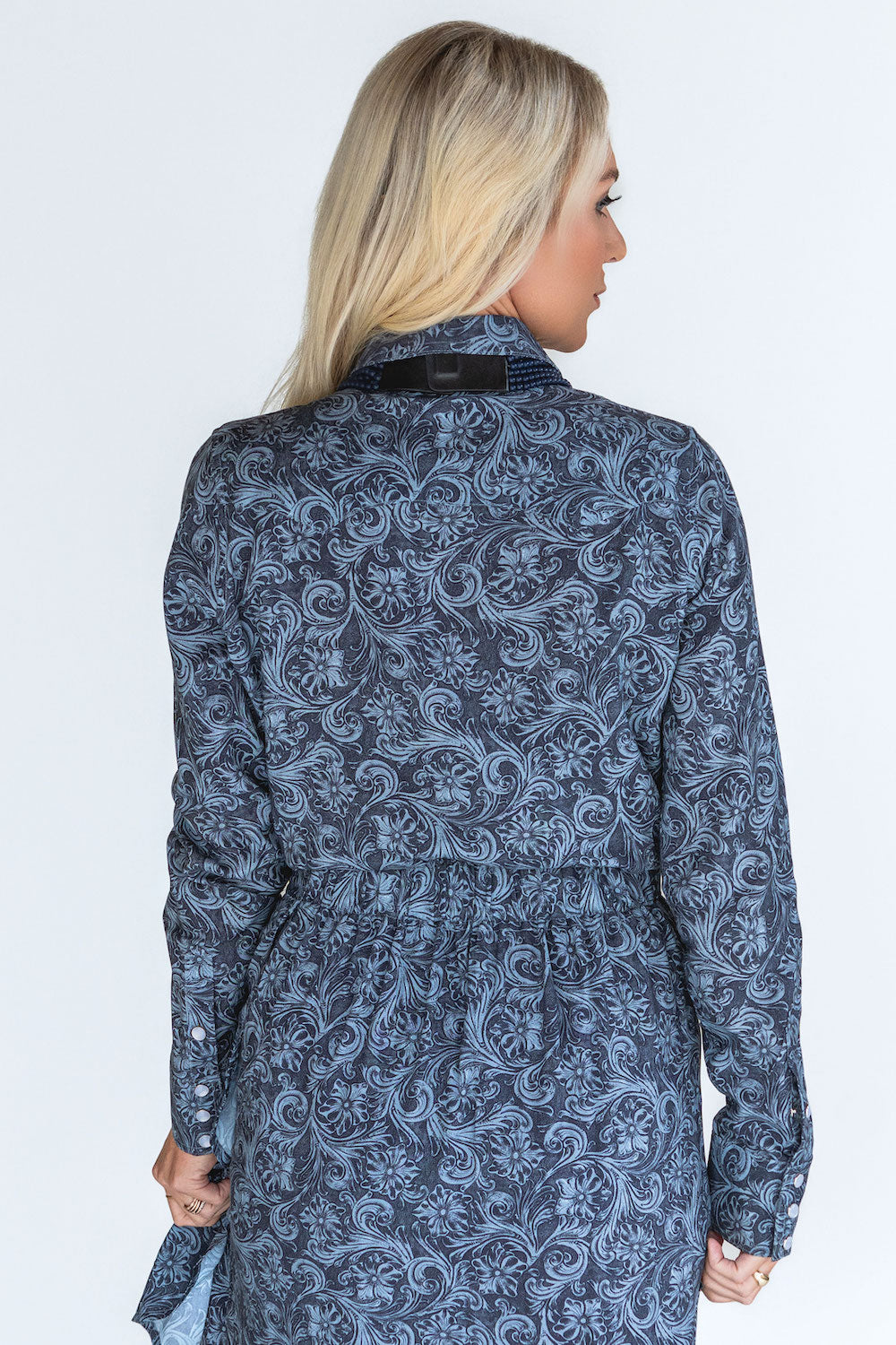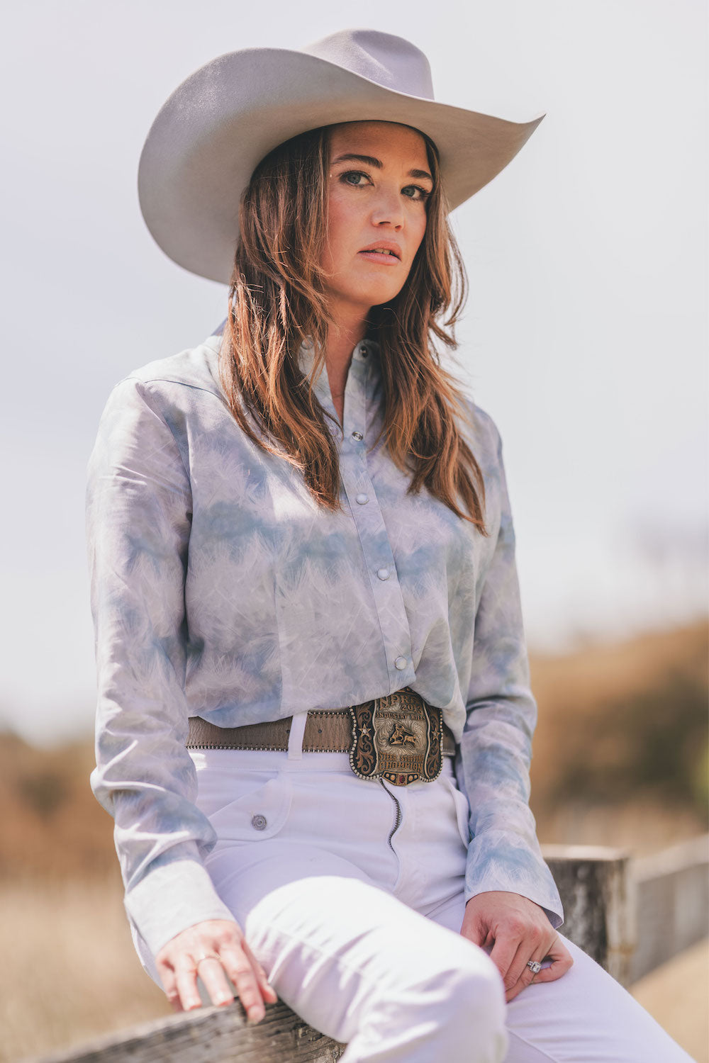 A reimagined balance of traditional western charm and contemporary chic, sure to become a staple in any coastal cowgirl’s closet. Both function and fashion-forward, this 100% Rayon poplin darling has pearl snap buttons and a traditional front and back yoke for the perfect feminine fit.  SKU# 23WS1801.
