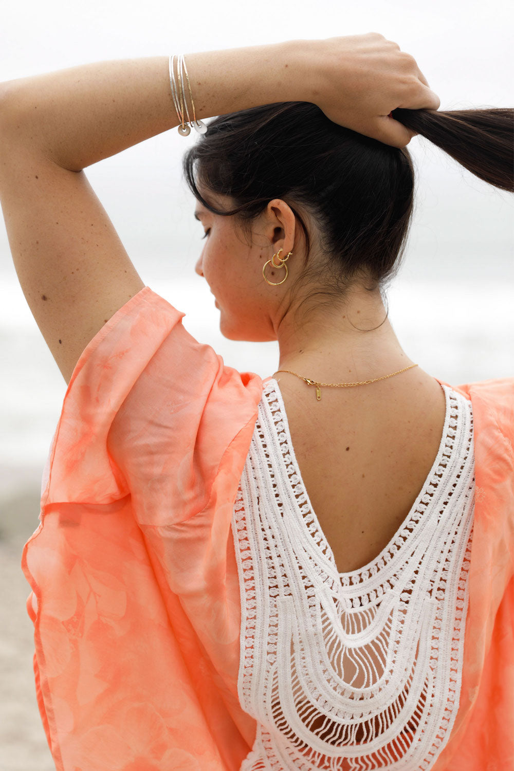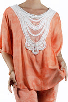 The Hannah top offers flattering butterfly sleeves and a gorgeous crochet medallion accent to add class and can be worn both in the front or the back! This top wears beautifully over your sports bra to and from class or out on the town! The Hannah top adds the perfect touch of boho beauty to your repertoire. 100% rayon. SKU# 23T212